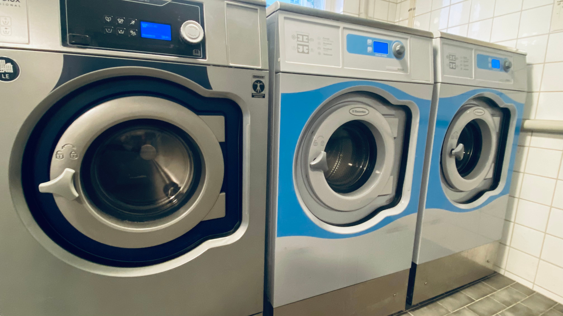 I tvättstugan i entréplanet finns tre tvättmaskiner, en torktumlare, ett torkskåp och en mangel.